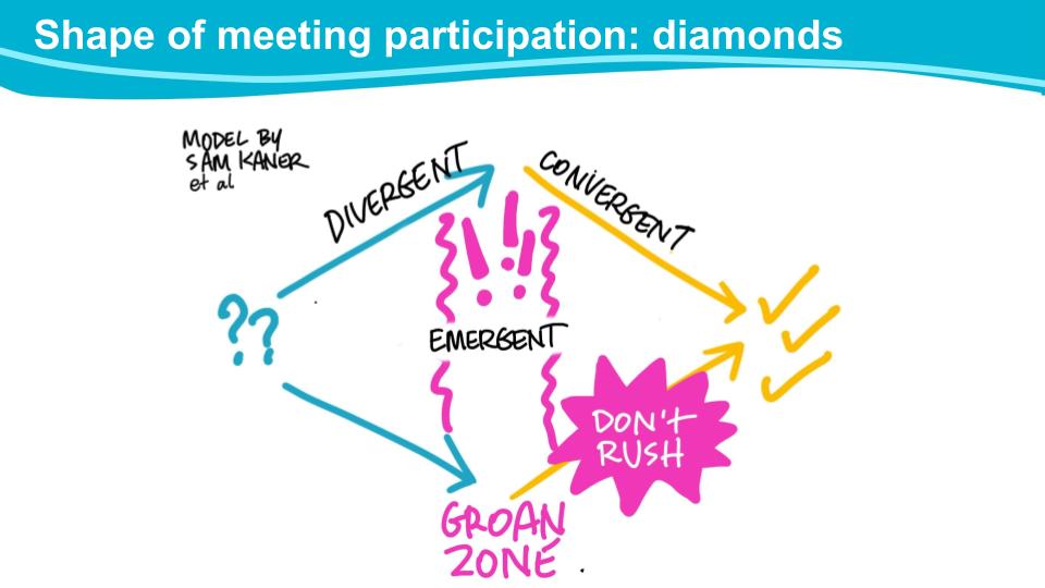 - Know the diamond of participation. Anticipate and respond wisely when the group shifts between divergence, emergence and convergence, so you can visualize what’s being called for