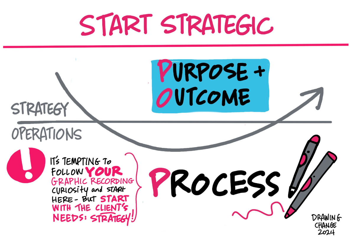You’ll be a stronger graphic recording partner in the room if you can start in the strategy zone with your questions. Ask about the big ‘why’ for the meeting: what’s meaningful to the client, what challenges are they facing. These are all about the purpose of the session, and then the outcome section is about the agenda and their goals for what’s going to happen as a result.